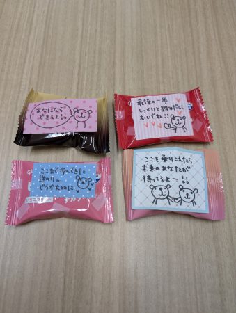 お菓子には、学生さんへのメッセージや国家試験の問題が手書きで添えられています。AIで何でもできてしまう時代ですが、やはり手書きには温かみがありますね。
