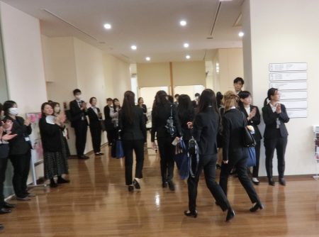 看護科学館では全教員が拍手で新入生を迎えました。