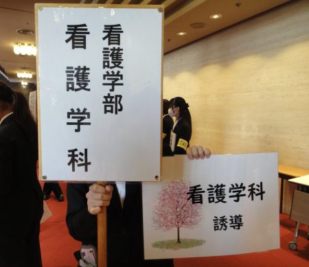 入学式を終えた学生の皆さんを、先輩がプラカードで看護科学館までご案内しました。