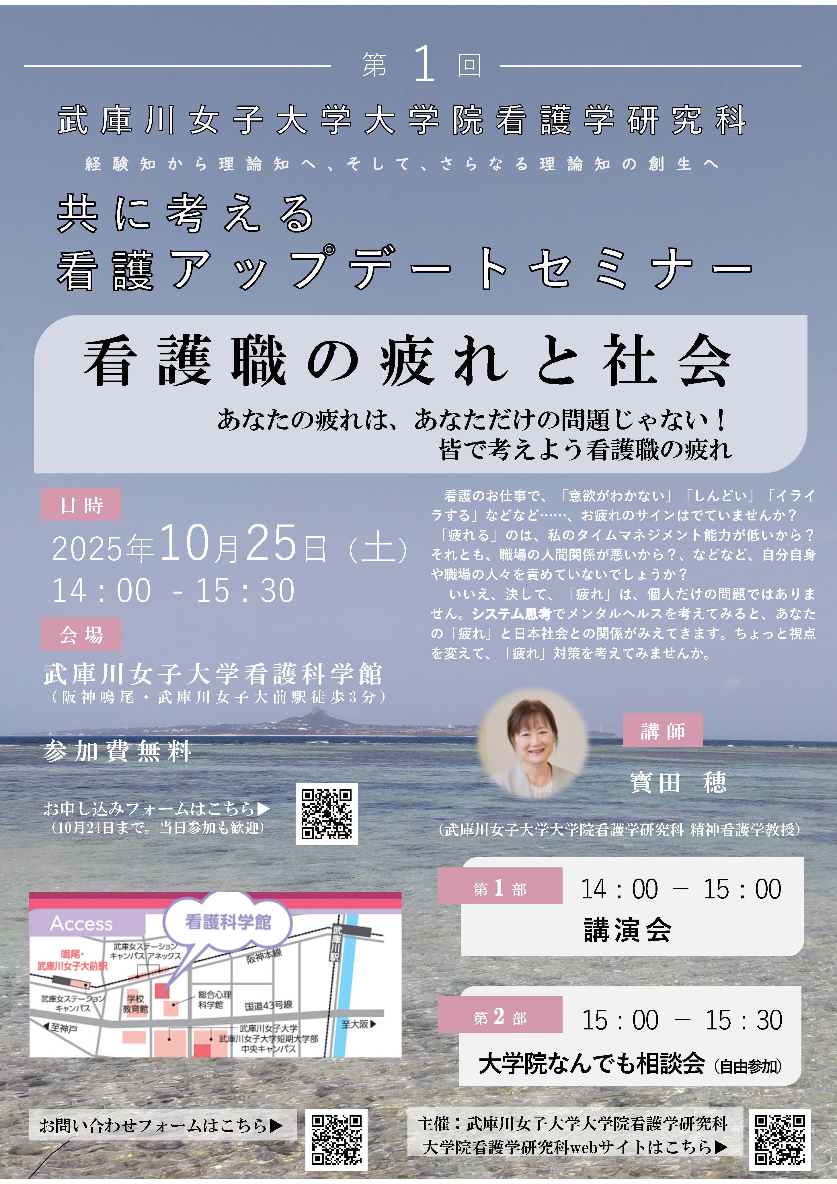 第1回「共に考える看護アップデートセミナー」のご案内です。 日時:10月25日(土)14:00~15:30 場所:武庫川女子大学看護科学館にて テーマ:看護職の疲れと社会 ーあなたの疲れはあなただけの問題じゃない!皆で考えよう看護職の疲れー 講師:精神看護学 寳田穂 教授 参加費無料 第1部 14:00~15:00 講演会 第2部 15:00~15:30 大学院なんでも相談会(自由参加) 詳細はこちら お申込はこちら